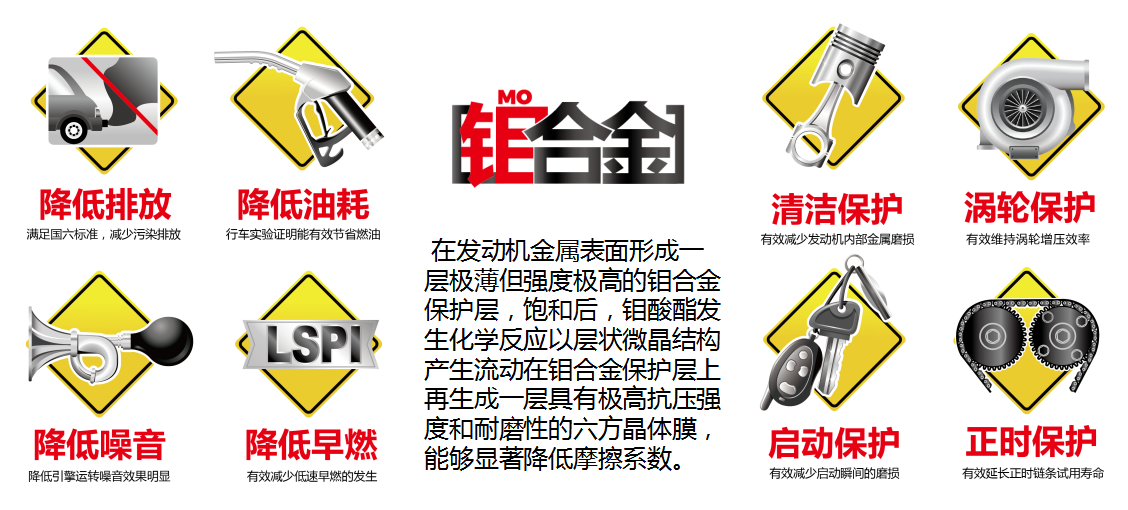 “钼合金双膜抗磨技术”会在发动机金属表面形成一层极薄但强度极高的钼合金保护层,饱 和后,钼酸酯发生化学反应以层状微晶结构产生流动在钼合金保护层上再生成一层具有极高 抗压强度和耐磨性的六方晶体膜,能够显著降低摩擦系数。 ”
